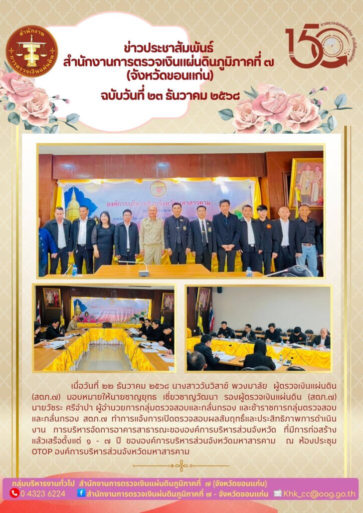 ทำการแจ้งการเปิดตรวจสอบผลสัมฤทธิ์และประสิทธิภาพการดำเนินงาน การบริหารจัดการอาคารสาธารณะขององค์การบริหารส่วนจังหวัด ที่มีการก่อสร้างแล้วเสร็จตั้งแต่ 1 – 7 ปี ขององค์การบริหารส่วนจังหวัดมหาสารคาม ณ ห้องประชุม OTOP องค์การบริหารส่วนจังหวัดมหาสารคาม