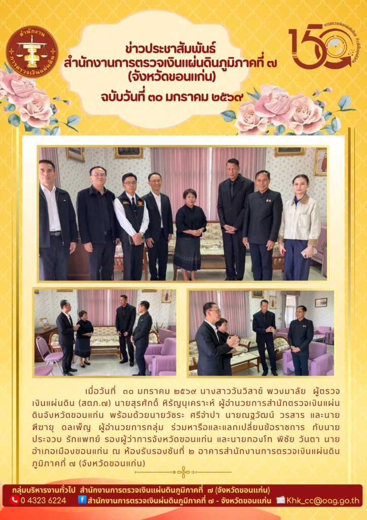 นางสาววันวิสาข์ พวงมาลัย ผู้ตรวจเงินแผ่นดิน (สตภ.7) นายสุรศักดิ์ หิรัญนุเคราะห์ ผู้อำนวยการสำนักตรวจเงินแผ่นดินจังหวัดขอนแก่น พร้อมด้วย นายวัชระ ศรีจำปา, นายณัฐวัฒน์ วรสาร และ นายทีฆายุ ดลเพ็ญ ผู้อำนวยการกลุ่ม ร่วมหารือและแลกเปลี่ยนข้อราชการ กับ นายประจวบ รักแพทย์ รองผู้ว่าราชการจังหวัดขอนแก่น และ นายกองโท พิชัย วันตา นายอำเภอเมืองขอนแก่น ณ ห้องรับรองชั้นที่ 2 อาคารสำนักงานการตรวจเงินแผ่นดินภูมิภาคที่ 7 (จังหวัดขอนแก่น)