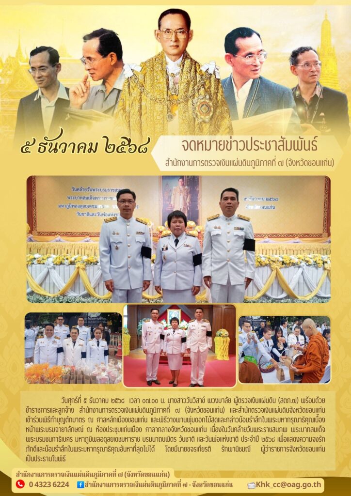 ข้าราชการและลูกจ้างสำนักงานการตรวจเงินแผ่นดินภูมิภาคที่ 7 (จังหวัดขอนแก่น) เข้าร่วมกิจกรรมวันคล้ายวันพระบรมราชสมภพ พระบาทสมเด็จพระบรมชนกาธิเบศร มหาภูมิพลอดุลยเดชมหาราช บรมนาถบพิตร วันชาติและวันพ่อแห่งชาติ วันที่ 5 ธันวาคม 2568