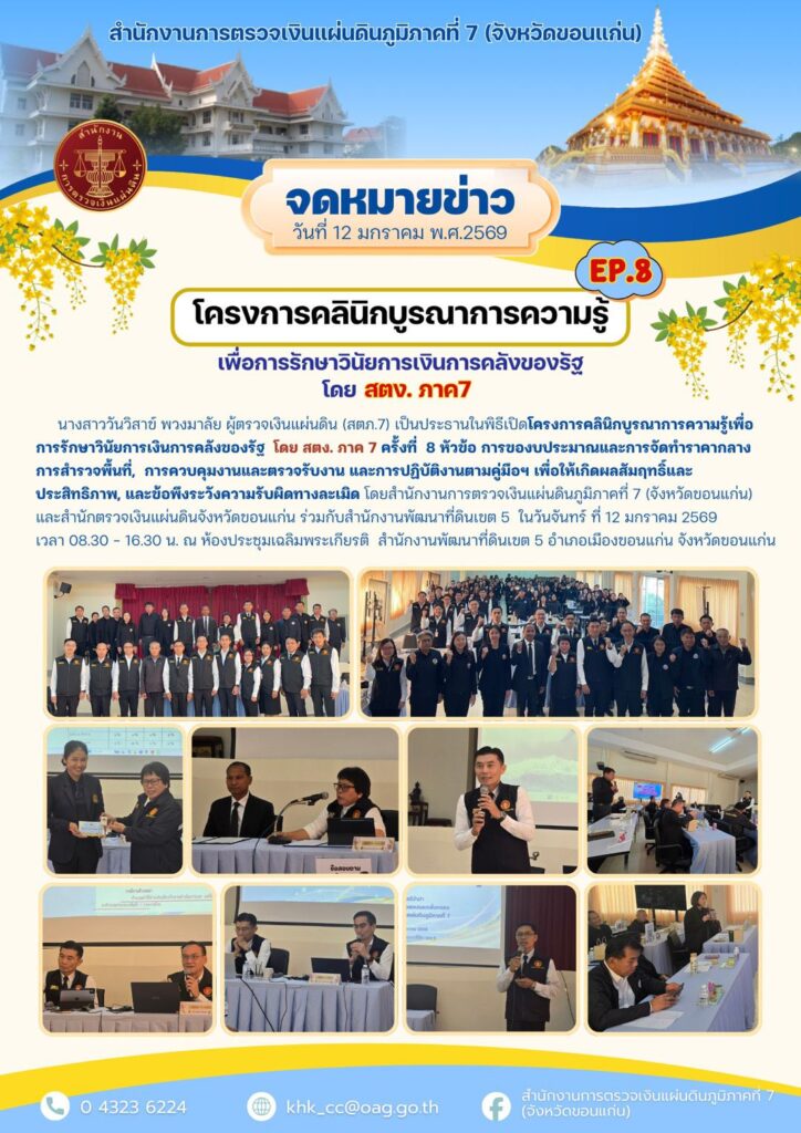 โดย สตง. ภาค 7 ครั้งที่ 8 หัวข้อ การของบประมาณและการจัดทำราคากลาง การสำรวจพื้นที่, การควบคุมงานและตรวจรับงาน และการปฏิบัติงานตามคู่มือฯ เพื่อให้เกิดผลสัมฤทธิ์และประสิทธิภาพ, และข้อพึงระวังความรับผิดทางละเมิด โดยสำนักงานการตรวจเงินแผ่นดินภูมิภาคที่ 7 (จังหวัดขอนแก่น) และสำนักงานการตรวจเงินแผ่นดินจังหวัดขอนแก่น