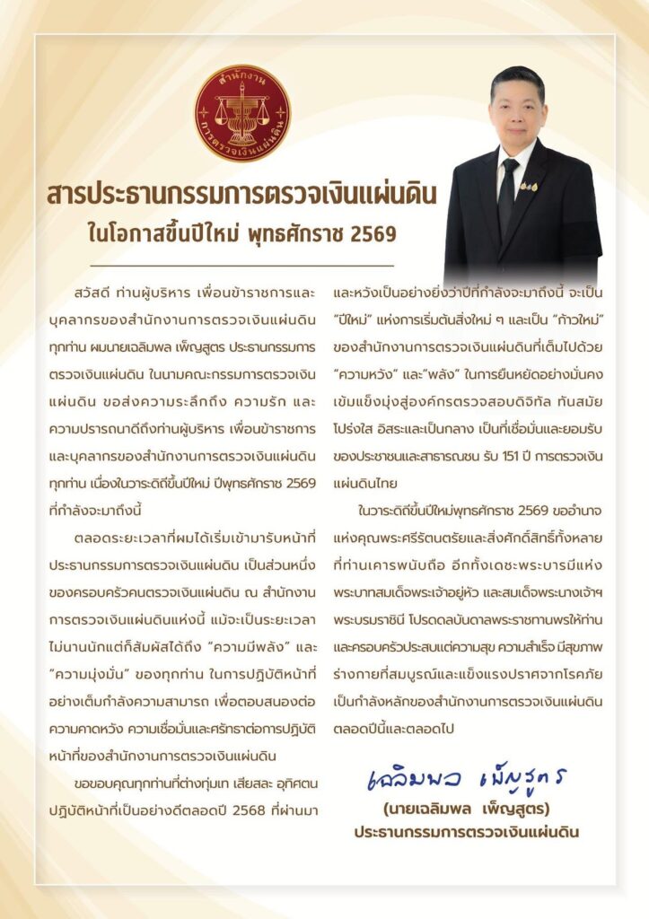 สารจากประธานกรรมการตรวจเงินแผ่นดิน เนื่องในโอกาสขึ้นปีใหม่ พุทธศักราช 2569กิจกรรมประชาสัมพันธ์, ข่าวที่น่าสนใจ, ข่าวประชาสัมพันธ์, อินโฟกราฟิกมกราคม 21, 2026 Post Views: 40