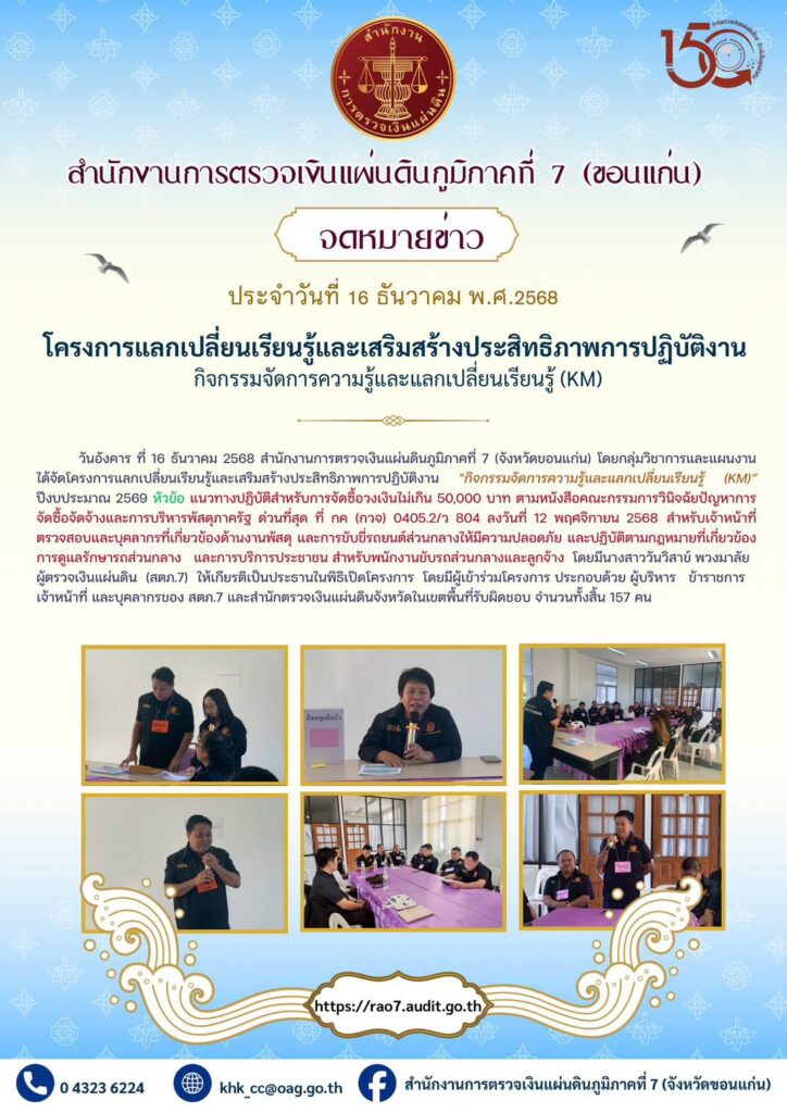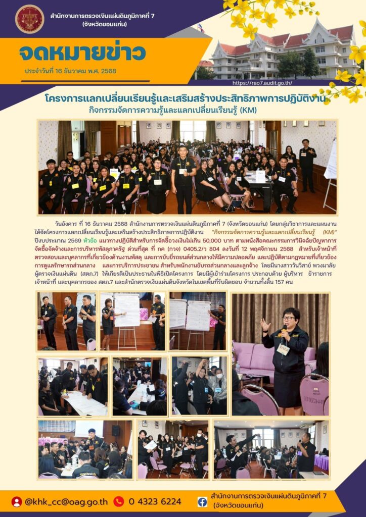 นางสาววันวิสาข์ พวงมาลัย ผู้ตรวจเงินแผ่นดิน (สตภ.7) ให้เกียรติเป็นประธานในพิธิเปิดโครงการแลกเปลี่ยนเรียนรู้และเสริมสร้างประสิทธิภาพการปฏิบัติงาน “กิจกรรมจัดการความรู้และแลกเปลี่ยนเรียนรู้ (KM)” ปีงบประมาณ 2569 ณ ห้องประชุมชั้น 3 สำนักงานการตรวจเงินแผ่นดินภูมิภาคที่ 7 (จังหวัดขอนแก่น) โดยมีผู้เข้าร่วมโครงการ ประกอบด้วย ผู้บริหาร ข้าราชการ เจ้าหน้าที่ และบุคลากรของ สตภ.7 และสำนักตรวจเงินแผ่นดินจังหวัดในเขตพื้นที่รับผิดชอบ จำนวนทั้งสิ้น 157 คน